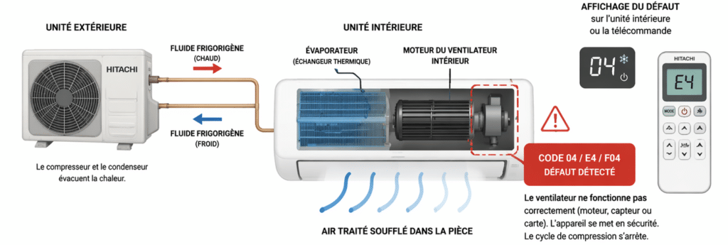Ce n’est pas un code anodin. Le ventilateur intérieur joue un rôle central dans le fonctionnement de l’installation : sans lui, l’échangeur thermique (l’évaporateur) ne peut pas diffuser le froid ou la chaleur. L’appareil coupe donc automatiquement le cycle de compression pour éviter un givrage ou une surchauffe interne. C’est un mécanisme de protection, pas une panne catastrophique en soi, mais ça ne veut pas dire que le problème peut attendre indéfiniment.